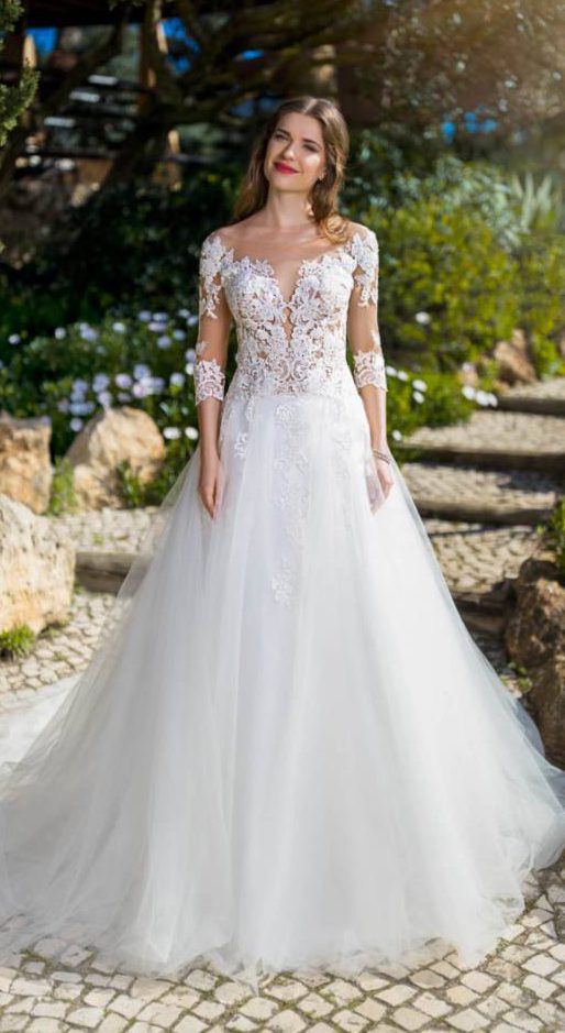 TRÈS CHIC 25218 by Très Chic bridal wear Meerdere lagen prachtige stoffen creëeren deze tijdloze en elegante ivoorkleurige A-lijn silhouet trouwjurk. Het lijfje wordt gekenmerkt door lange mouwen en een hoge halslijn van doorschijnend kant op een sweetheart halslijn. De achterzijde heeft een prachtig key-hole rugdetail. De elegante rok bestaat uit meerdere lagen (glitter) tule…
