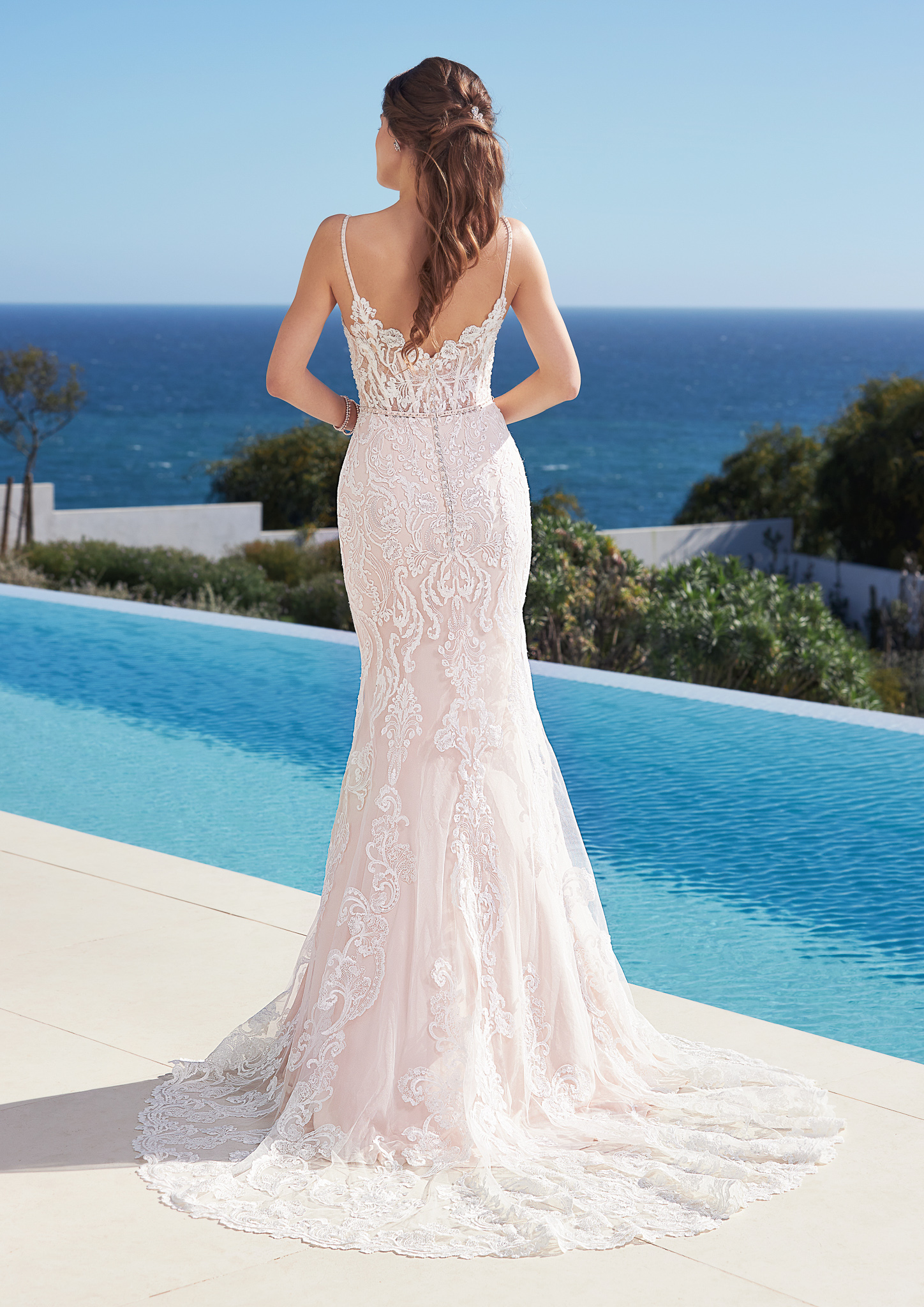 Deze glamoureuze champagnekleurige fit & flare bruidsjurk is voorzien van een delicate all-over-lace kanten lijfje en rok en is ontworpen met een V-vormig hals- en rug detail. Het lijfje is gemaakt in een korsetstijl en de dunne bandjes zijn afgewerkt met glazen applicaties. De rok heeft een laag glittertule om diepte en dimensie toe te voegen aan deze luxe bruidsjurk en is voorzien van een prachtige luxe sleep.