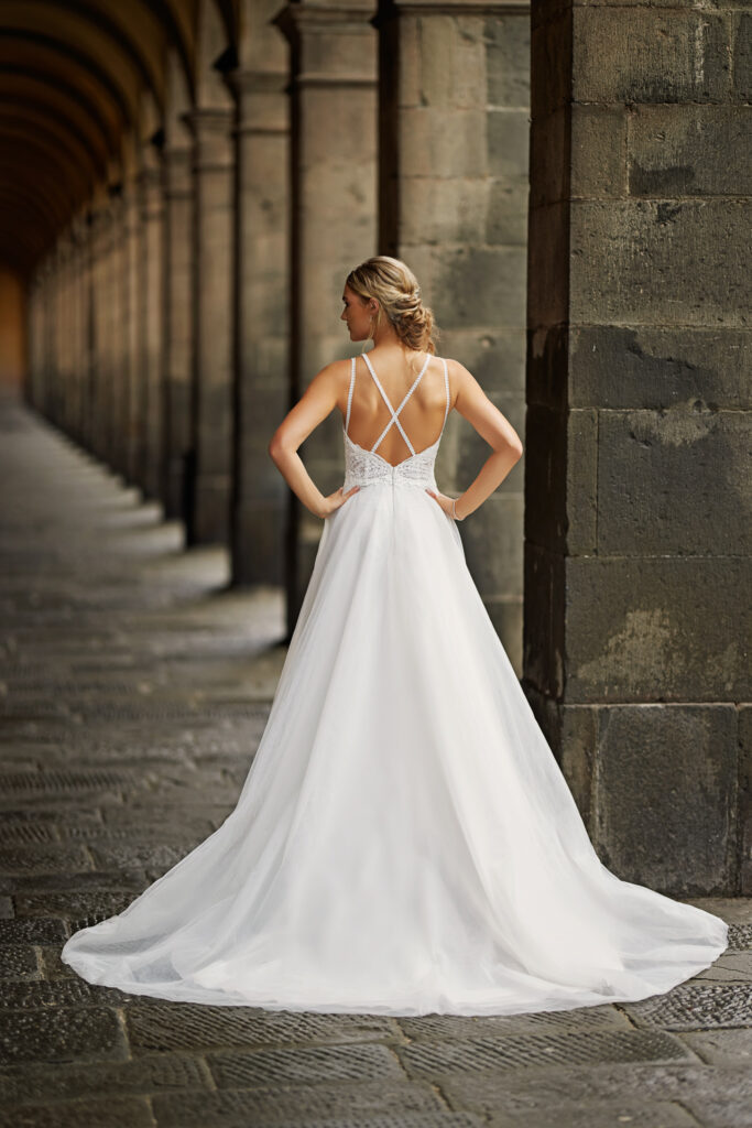 Deze elegante en moderne A-lijn silhouet trouwjurk is ontworpen met een V-vormige halslijn en dunne bandjes bewerkt met kant. De jurk heeft een bijzonder gekruist rug-accent. De eenvoudige elegante rok bestaat uit meerdere lagen tulle en is afgewerkt met een sleep.