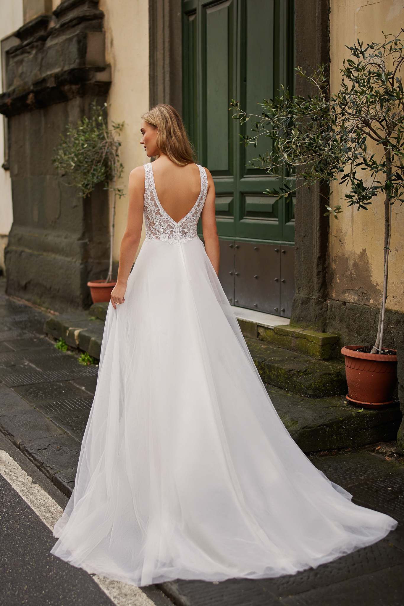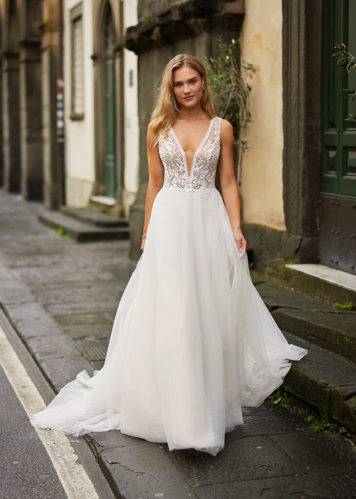 Deze opvallende maar elegante A-lijn silhouet trouwjurk is ontworpen met prachtige kanten panelen die dramatische V-vormige designelementen creëren aan de voor- en achterkant van het lijfje. De eenvoudige elegante rok bestaat uit meerdere lagen tulle en de sleep geeft de jurk een romantische touch.