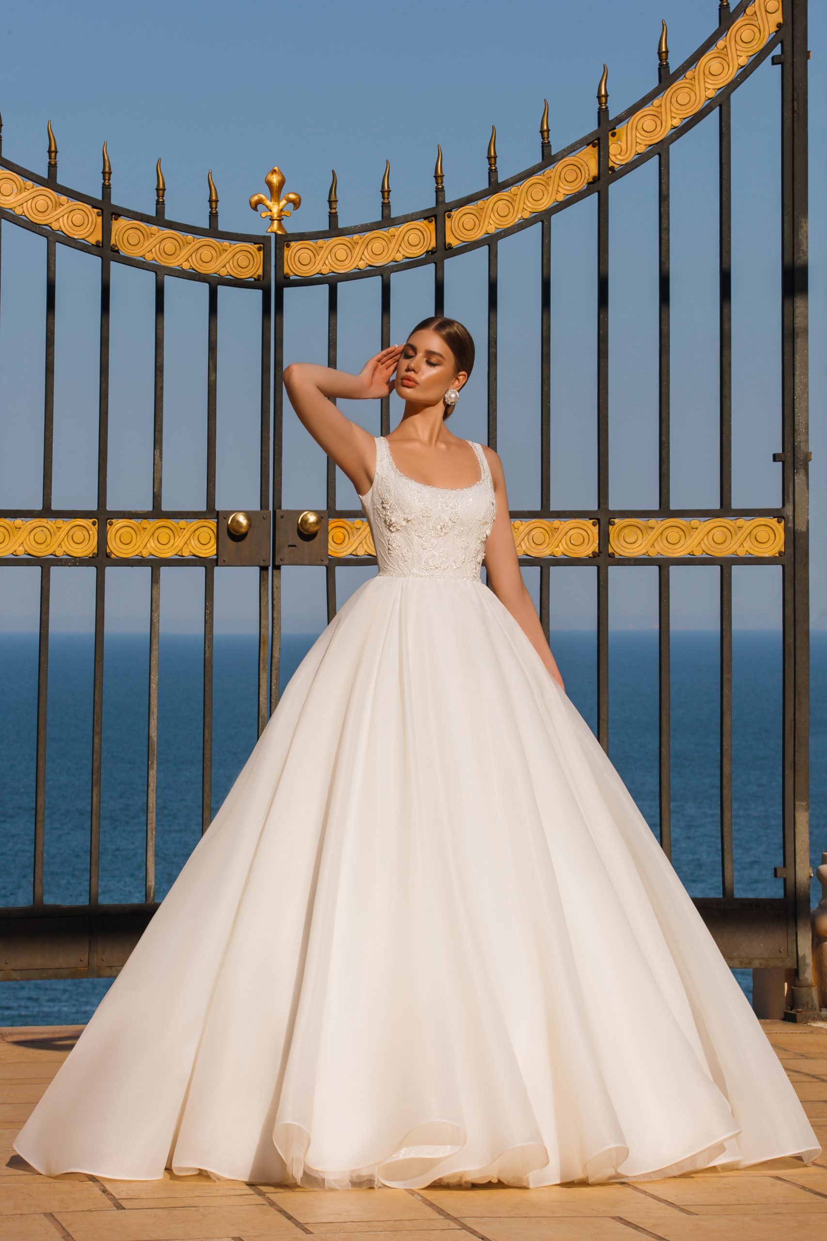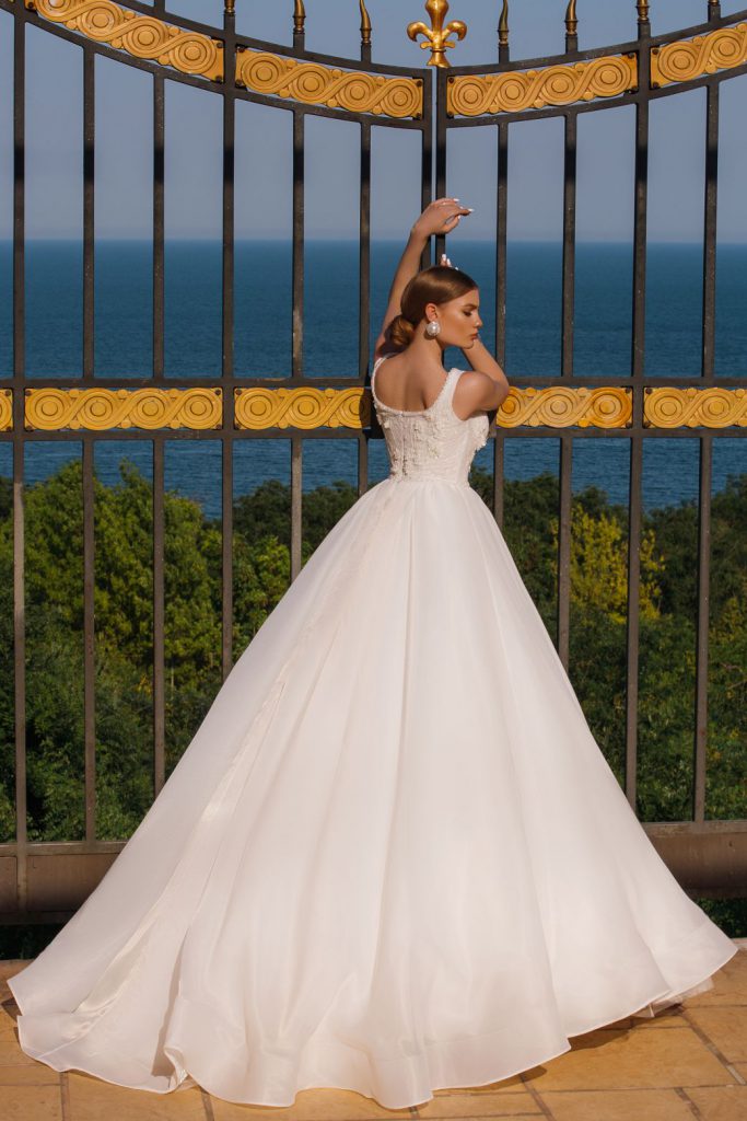 Luxe jurk met een weelderige gelaagde rok een een lange sleep. Korset lijfje met brede bandjes, versierd met bloemkant, geborduurd met kralen, pailletten en kristallen, wat de jurk romantischer en delicater maakt.