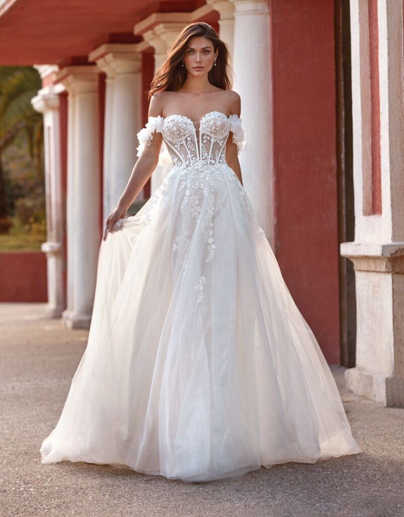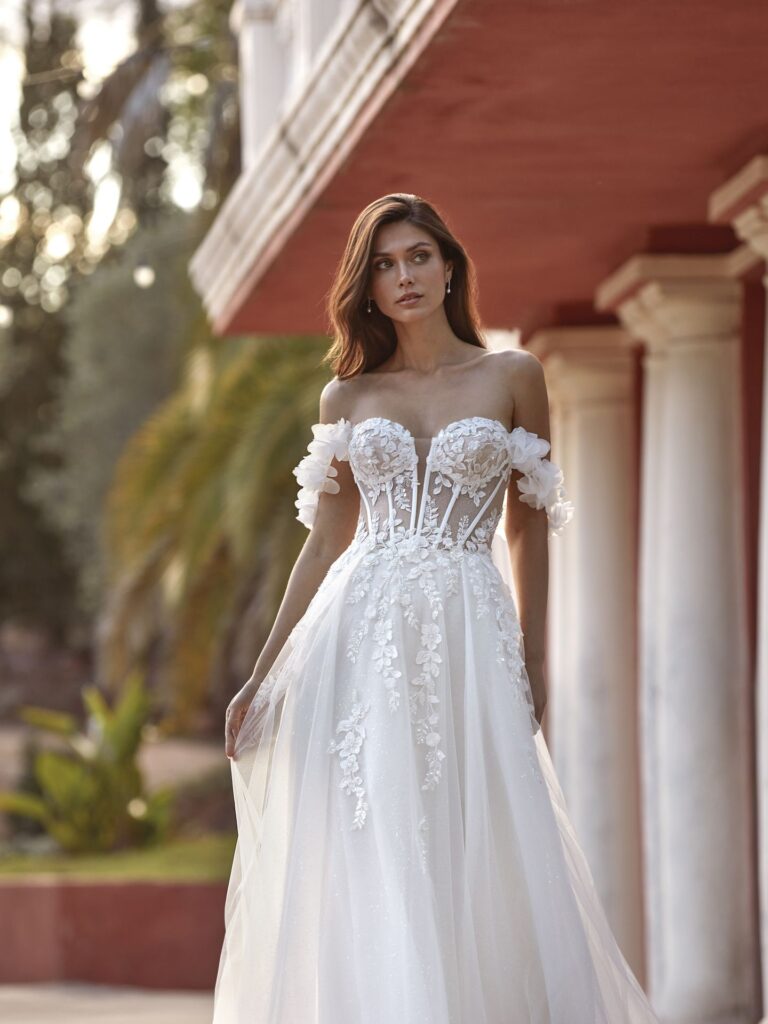 Deze adembenemende baljurk uit de nieuwste collectie van Amélie Bridal is een perfecte combinatie van romantiek, elegantie en vakmanschap. Het geliefde bruidsmodemerk staat bekend om haar vrouwelijke lijnen, subtiele details en moderne romantiek — een stijl die naadloos past binnen onze collectie 2026.