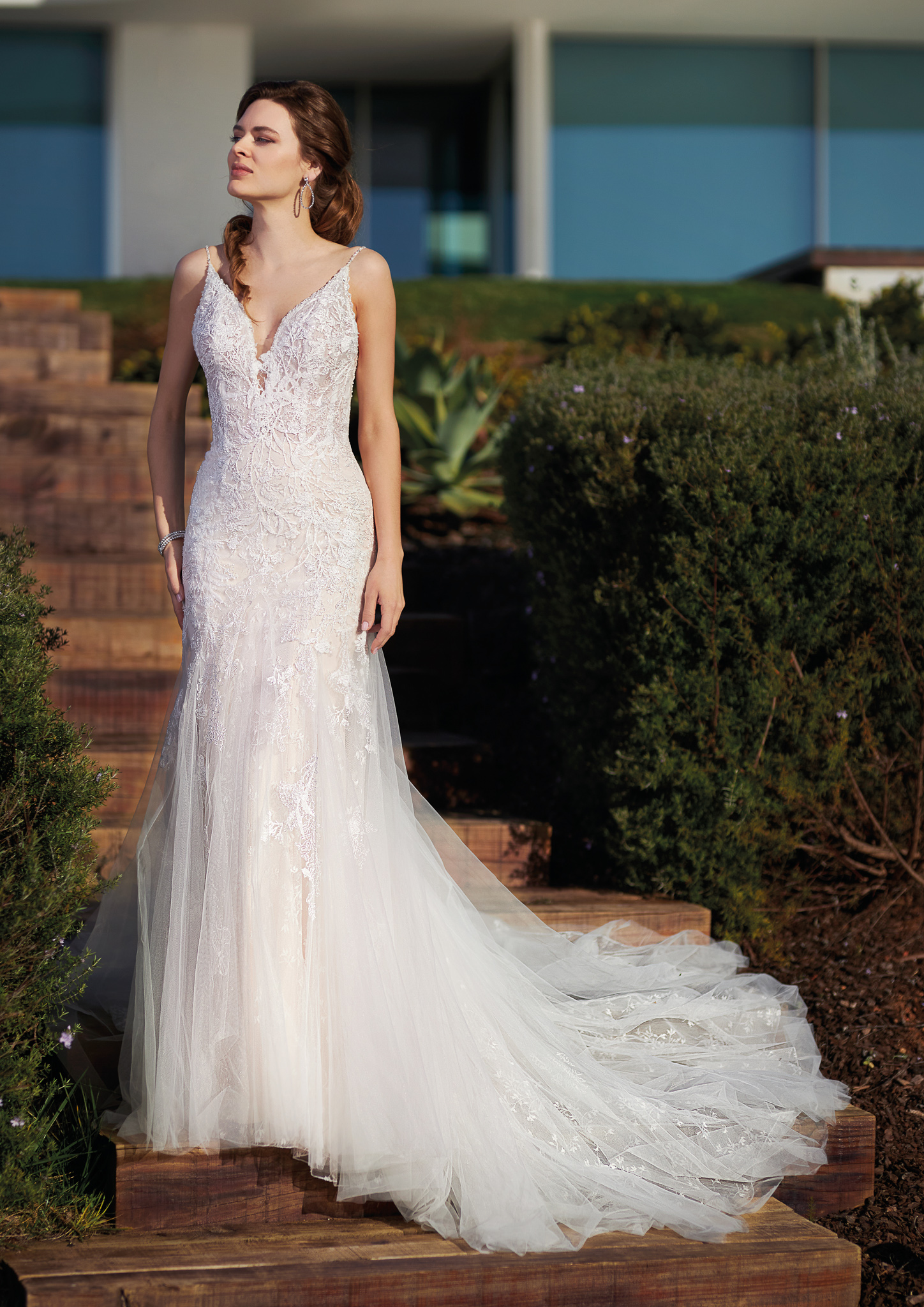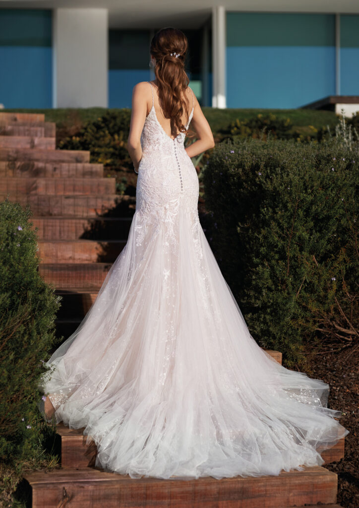 Deze luxe en elegante all-over-lace trouwjurk met een zeemeermin/fit & flare silhouet is ontworpen met een diepe V-hals en een bijzonder rugdetail. De jurk is afgewerkt met een sleep bestaande uit meerdere lagen tule, met richting het uiteinde bijzondere kanten accenten. Deze glamoureuze en nauwsluitende stijl zal je figuur prachtig accentueren.
