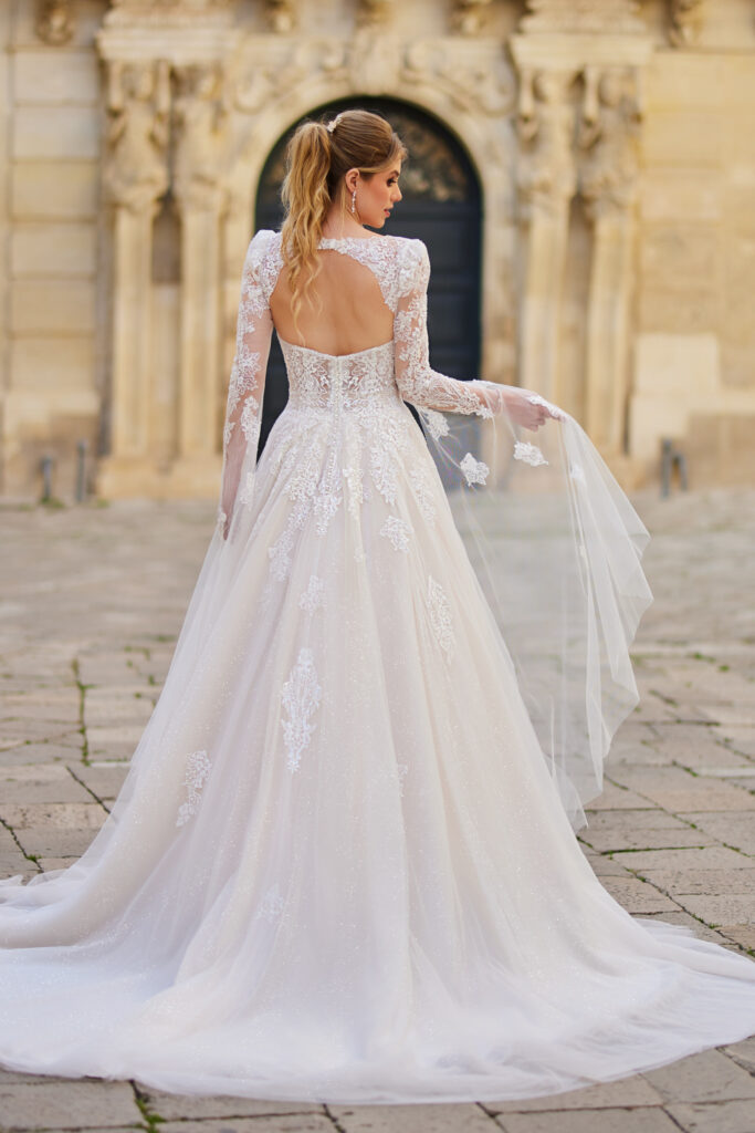 lange mouwen om een andere verschijning te creëren tussen de ceremonie en de receptie. Het