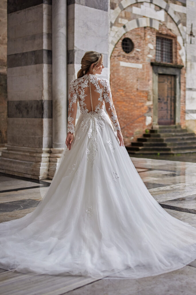 Meerdere lagen prachtige stoffen creëeren deze tijdloze en elegante ivoorkleurige A-lijn silhouet trouwjurk. Het lijfje wordt gekenmerkt door lange mouwen en een hoge halslijn van doorschijnend kant op een sweetheart halslijn. De achterzijde heeft een prachtig key-hole rugdetail. De elegante rok bestaat uit meerdere lagen (glitter) tule en de sleep geeft de jurk een romantische touch.