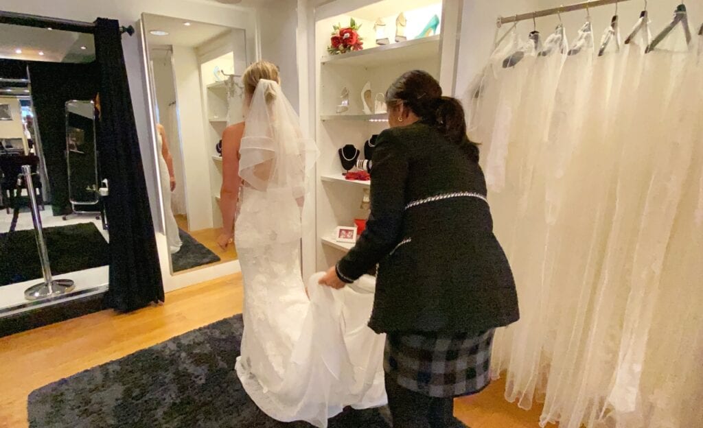 Omdat wij van indebuurt altijd met onze neus in de boter vallen, mogen Heleen en Rosanne zelf ervaren hoe het is om bij Promesa op zoek te gaan naar een trouwjurk. Niet dat een van ons gaat trouwen, dus daarom vertellen we Christa niet hoe onze droomjurk eruit ziet, maar laten haar jurken uitzoeken die ze bij ons vindt passen.